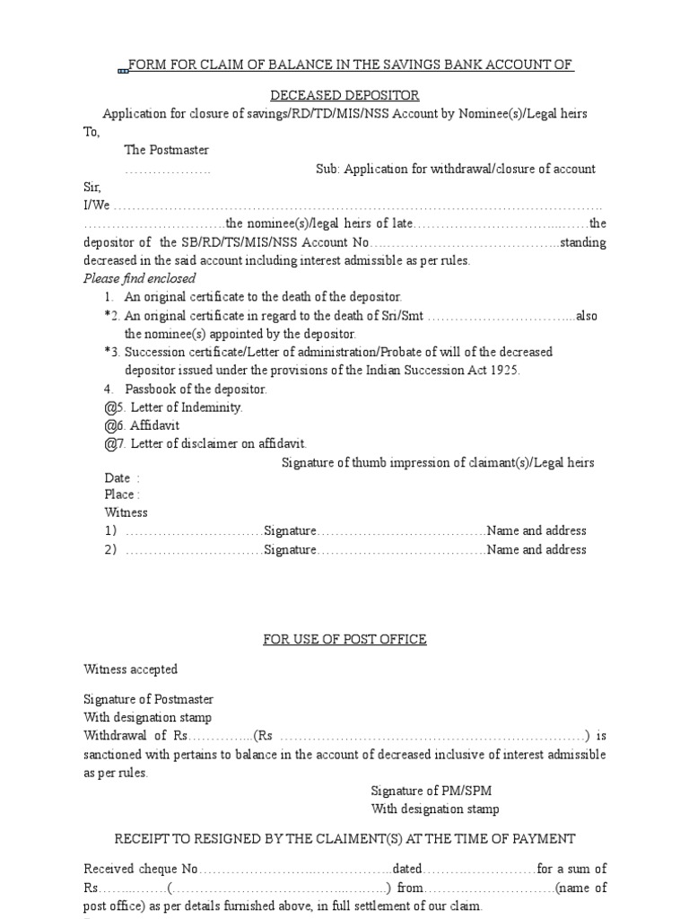 Form For Claim Of Balance In The Savings Bank Account Of Deceased Depositor